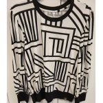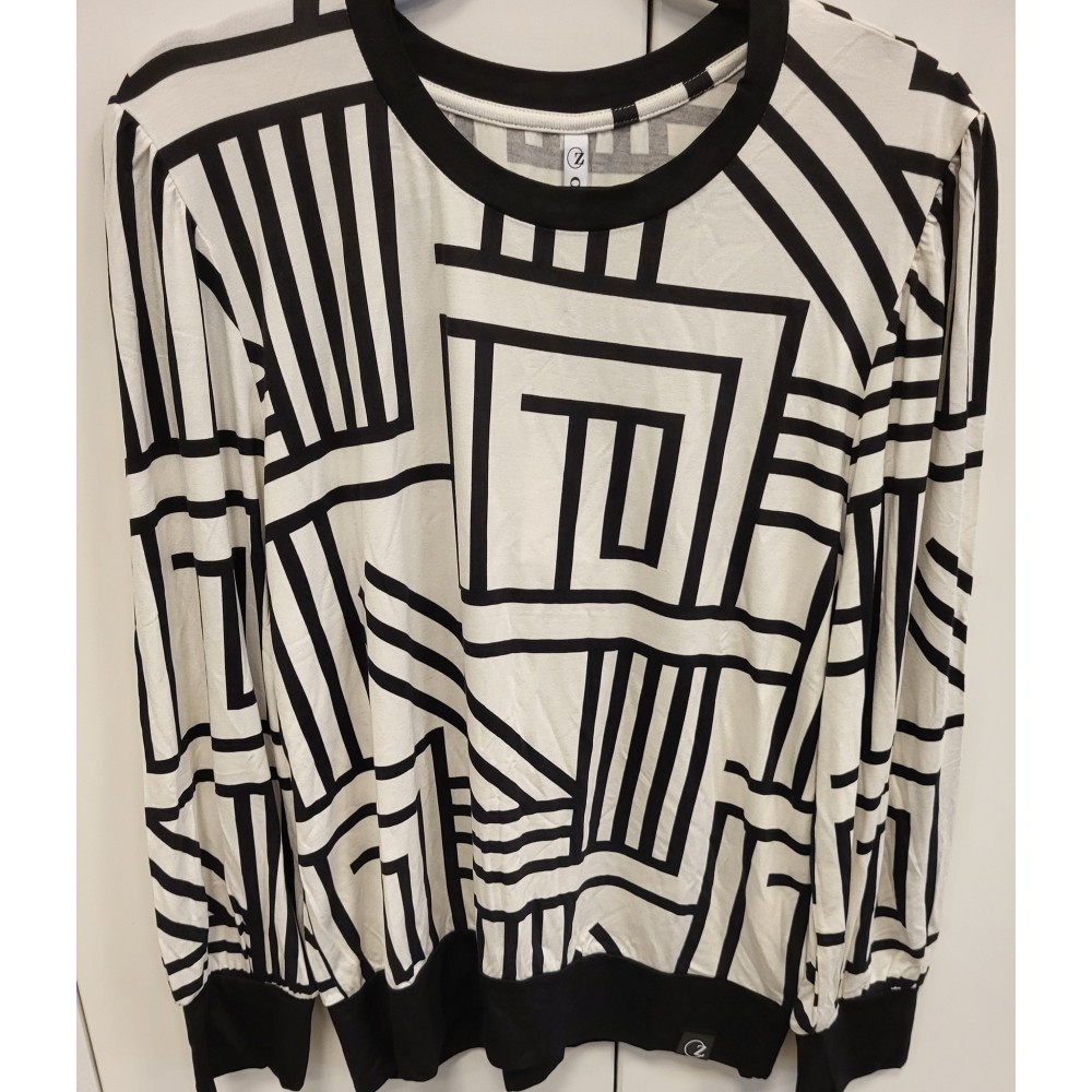 Top van Zoso in de kleuren ivoor/Zwart in een geografische allover print met aan de onderkant een zwarte band. Ook aan de onderkant mouwen zit een zwarte band.