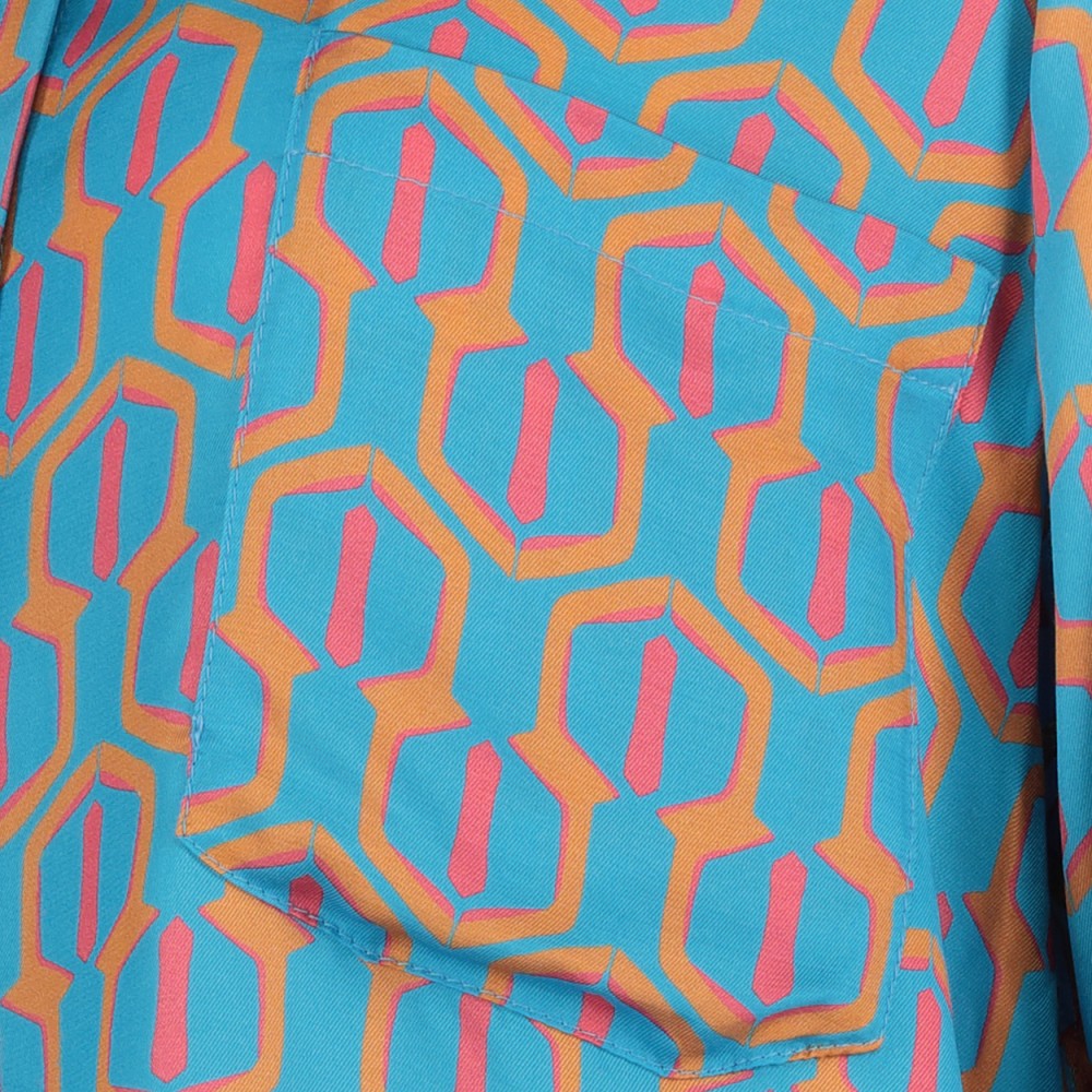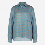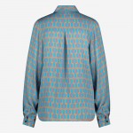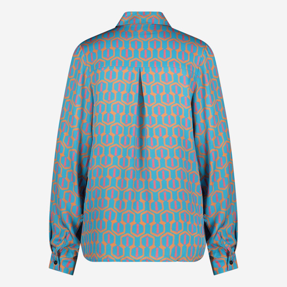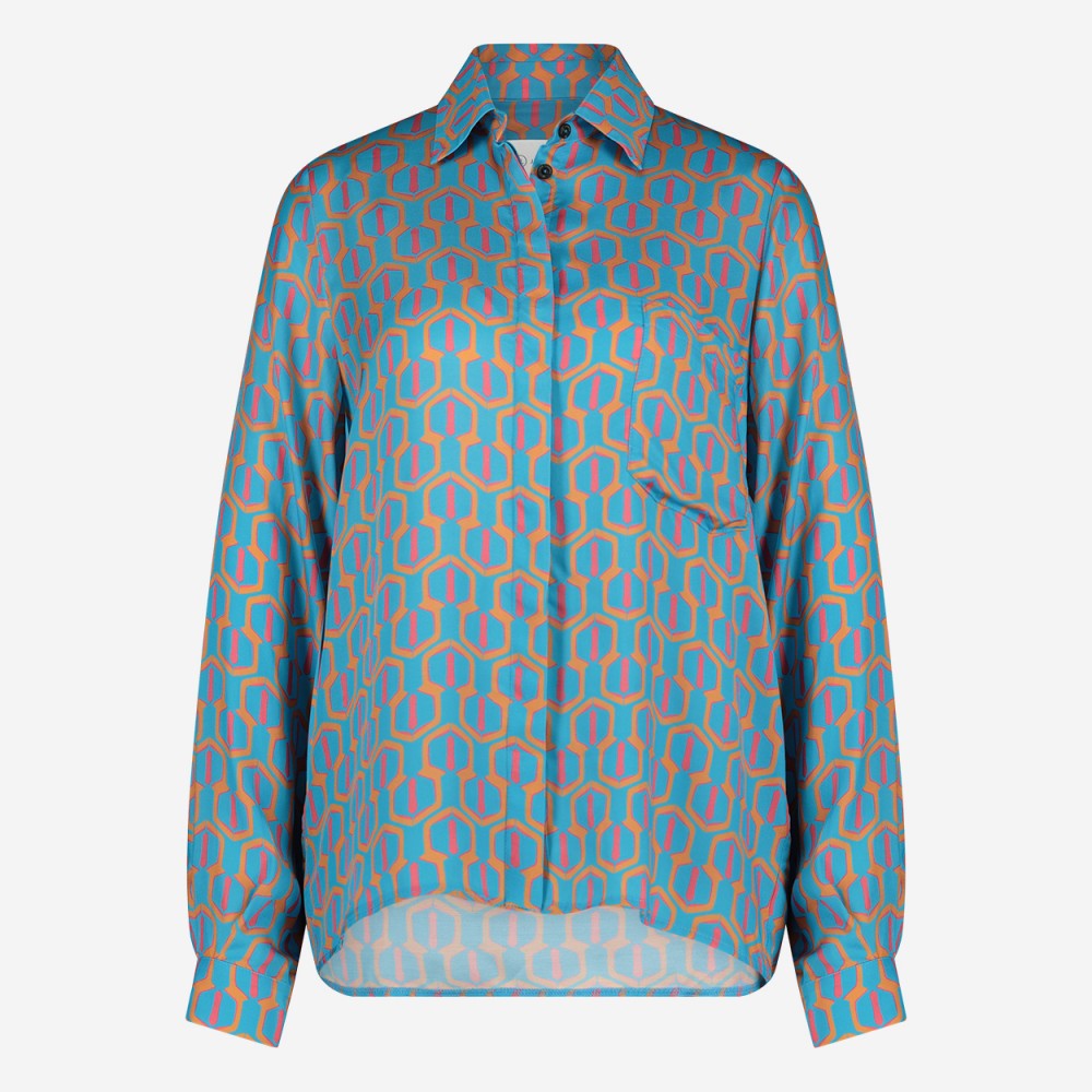Sisi Blouse is een vrouwelijke glanzende blouse uit de Jane Lushka Collectie. Blouse met een kraag en heeft bedekte knoopjes. Een prachtige blouse  in multicolor aquablauw met oranje.  Blouse Sisi heeft een chique uitstraling en is ietwat speels door de uitgesproken print.