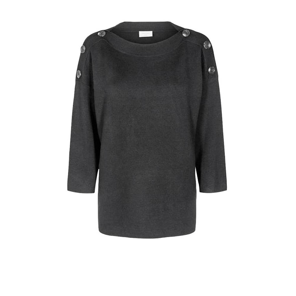 Mooie antraciet grijze pull in fijn gebreide viscosemix. Deze trui heeft een aansluitende ribboord hals met knopen op de schouder