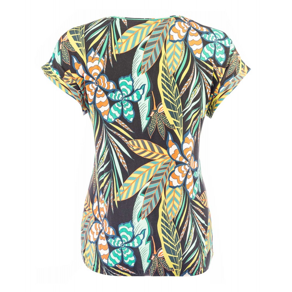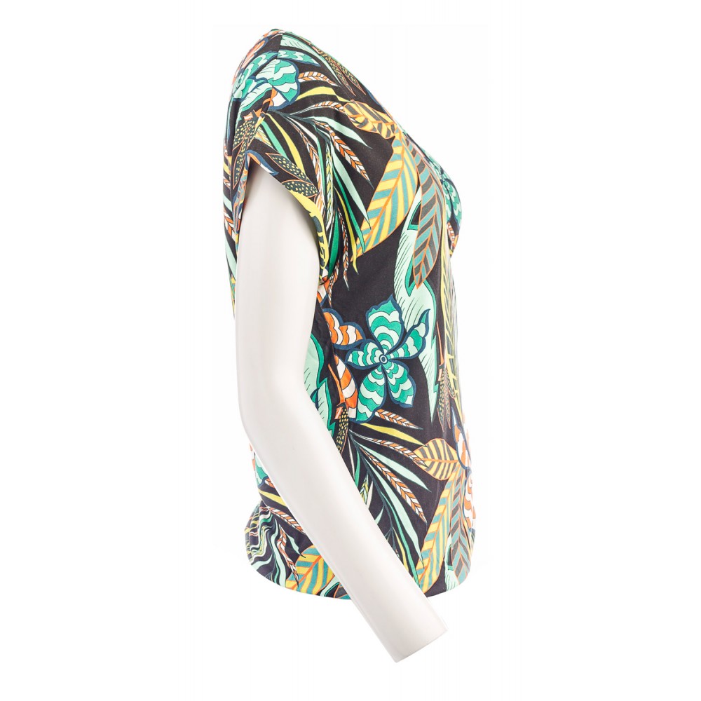 De top heeft een v-hals met een biesje en een aangeknipt mouwtje met omslag.