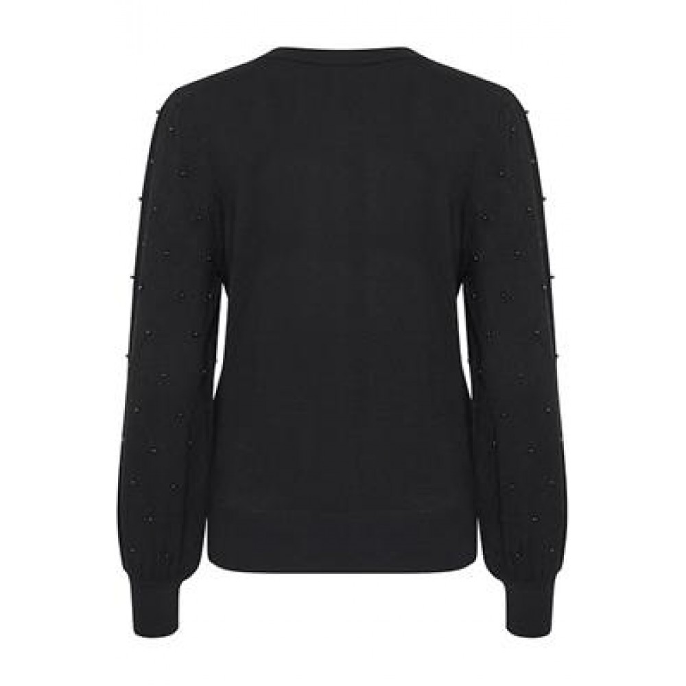 De karen pullover is een fijngebreide trui met lange wijde mouwen die zijn afgewerkt zijn met parels